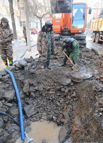 “在岳阳街与至善路交会往东,马路边有一处自来水管漏水,水量非常大,已经快流到树勋街口,路边有多辆车都冻上了。”1月31日清晨长春市南关区环卫工人突然发现管辖的街道已经成了冰天雪地,经查明供水管网的漏损点在岳阳街与至善路交会处东50米处,此处漏水管道为直径150毫米的次供水管道。抢修人员在漏水现场用挖掘机械挖出一个长约2米、宽约1米、深约2米的深坑,查明供水管道的漏水点。随后,供水抢修人员将“哈夫节”(一种管路抢修装置,由两个半圆组成,套在一起能组成一个箍)用螺丝拧紧后,整个管道抢修工作在两个小时内结束,随即开始回填沙石平整路面。与此同时,负责相关地段的南关环卫工人开始清理积冰,据负责人表示整条路段清理干净至少需要两到三天,他们会尽快恢复路面畅通。