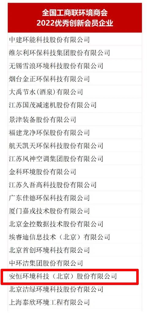 今年9月,环境商会启动“2022年度优秀创新会员企业”征集工作。经过严格的申报、审核流程,安恒环境科技(北京)股份有限公司获得“2022年度优秀创新会员企业”荣誉。未来,根据国家、省、市级名单的不断增补,形成环境商会年度优秀创新企业榜单。具体名单如下: